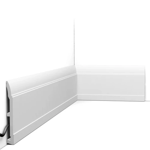 Современный плинтус с линейным рисунком. Сдержанный дизайн этого плинтуса позволяет использовать его в различных стилях оформления.